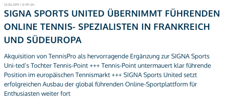 SIGNA Sports United übernimmt TennisPro, den führenden Online Tennis-Speziallisten in Frankreich und Südeuropa. Die Übernahme umfasst auch das Franchise-Netz mit 46 Filialen und dient dem Ausbau der führenden Position in Europa. Lesen Sie mehr